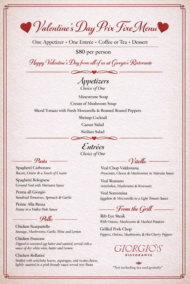 We at Giorgio's would like to welcome you to our restaurant, where the fine dining experience is transformed into a family affair. Our family owned and operated restaurant has been a South Orange staple since 1989. Our authentic Italian cuisine speaks for itself, so allow us the pleasure of providing you with a memorable dining experience. We look forward to welcoming you to our restaurant, where you will become part of our family.